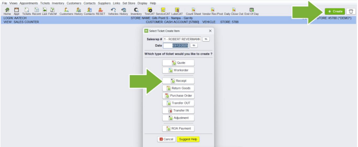 To receive inventory, click the Create button, then Receipt.