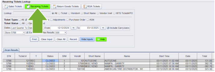 All Receipts in HITS for inventory, nonstock, and expenses can be seen from the Receiving Ticket Lookup screen, found via the Home button.