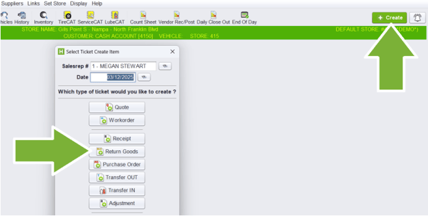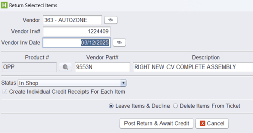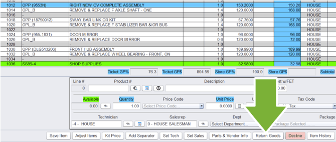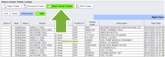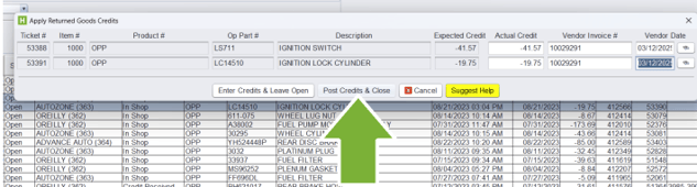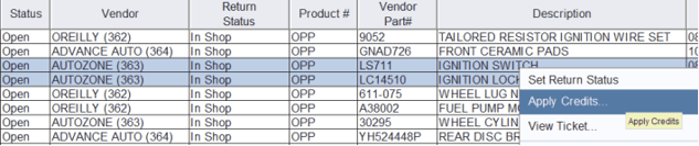 Returns and Credits are managed from the Home, Returned Goods Ticket tab. This tab will track all the parts that are pending credit from vendors.